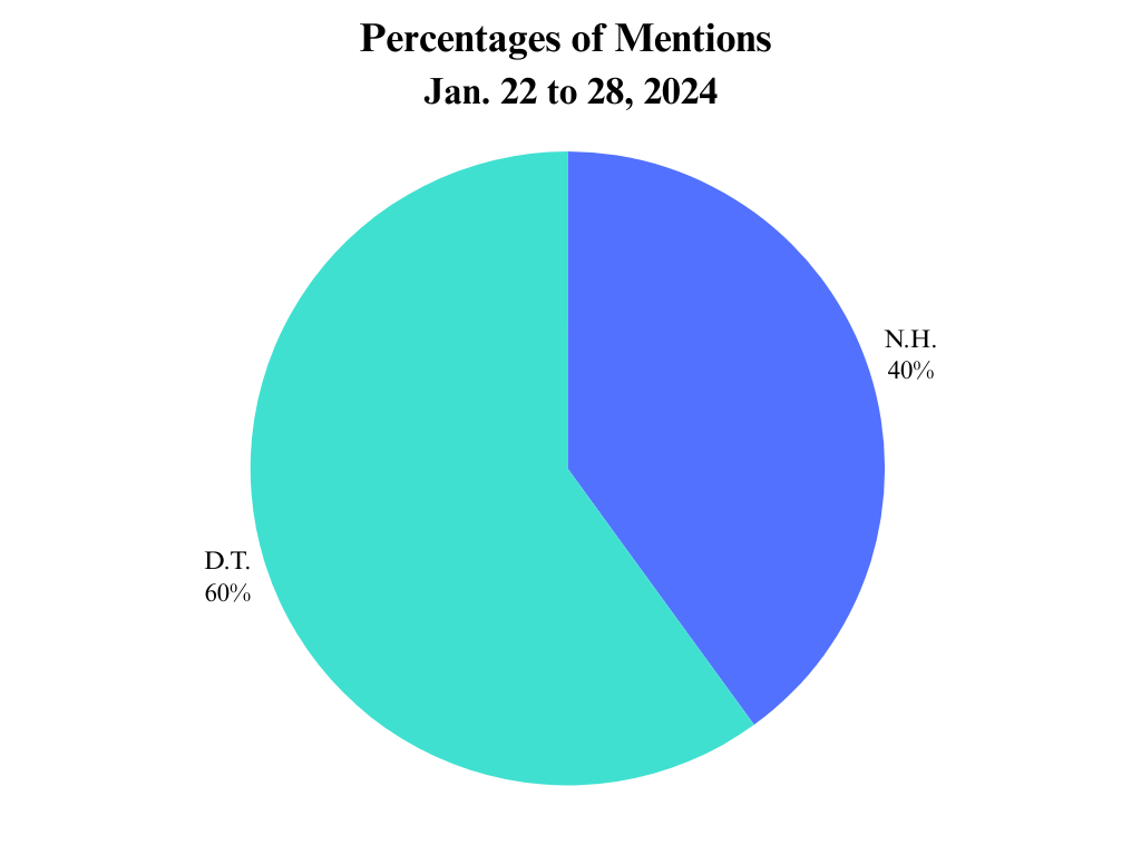Specifically, we tracked name mentions of primary candidates from January 2–13 in news stories about the 2024 elections. We did not include news stories about candidates’ legal proceedings, unless the 2024 elections were directly referenced. We also did not count opinion pieces, except for one piece by an editorial board focused on the 2024 elections. Though we analyzed both print and broadcast news, we eventually focused on 24 stories from one outlet in order to analyze a consistent, focused data set.